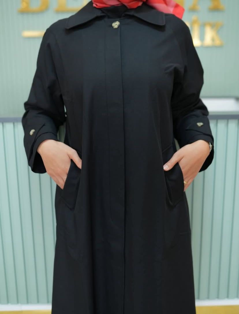 Pamuk karışımlı kumaştan, gizli patlı, yakalı, reglan kollu, manşetleri dekoratif düğmeli ve üçgen kesimli, arka pelerinli, arkası uzun A pilili, çapraz yan cepli, rahat kesimli trençkot.
